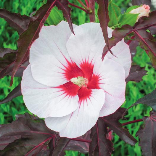 Avec CAROUSEL® Jolly Heart, place à l’émotion ! Chaque fleur de cet hibiscus, large de 25 cm, déploie des pétales blanc rosé délicatement teintés d’un cœur framboise, comme un cœur qui bat au rythme d’un carrousel enchanté. Son feuillage pourpre accentue ce contraste spectaculaire. Installez-le au soleil, en sol riche et frais, avec des arrosages généreux l’été. Rustique jusqu’à -15 °C, il disparaît l’hiver pour mieux renaître l'été suivant. Une attraction florale qui fait chavirer tous les cœurs.