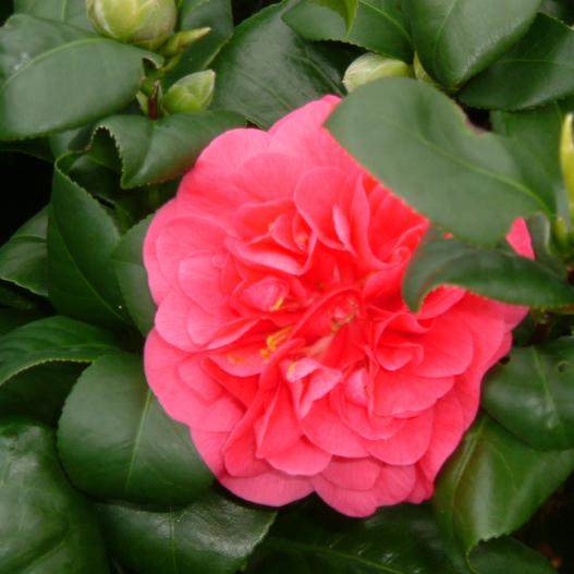Ce camelia est unique avec ses branches tordues. Il fleurit fin février, ce qui le met à l'abri des principales intempéries. Ses fleurs rouge braisé sont nombreuses et tiennent longtemps ouvertes. Son feuillage est brillant. Il trouve sa place à mi-ombre en premier plan de massif ou en pot.