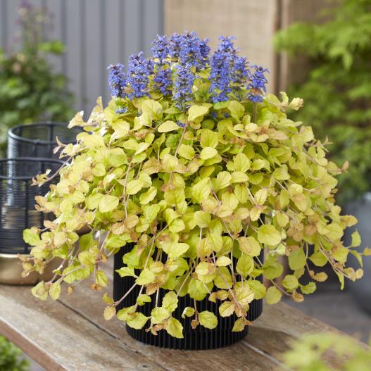 L'Ajuga Feathered Friends Parrot Paradise est une nouvelle variété de bugle avec de grandes feuilles arrondies couleur vert-jaune dont les pointes sont colorées d'une teinte cuivrée. Une variété lumineuse qui porte au printemps des épis de fleurs bleu cobalt. Une vivace originale et colorée qui trouvera sa place dans un sol frais, à l'abri du soleil de l'après-midi.