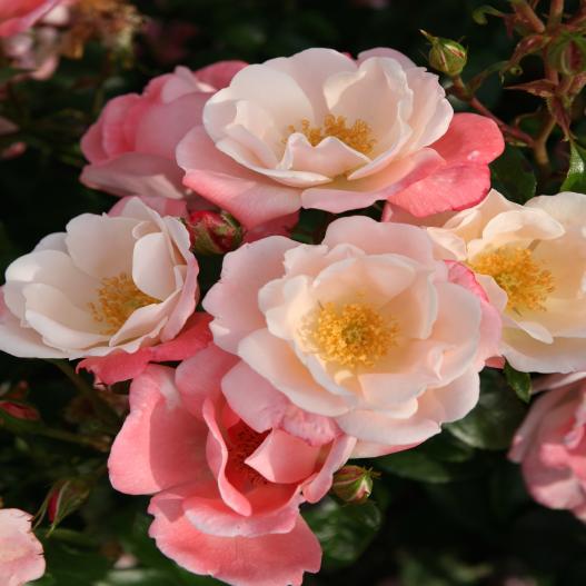 Très élégantes, les petites roses crème et rose saumon au bouquet d'étamines jaune d'or s'illuminent sur un feuillage vert vernissé et très sain. Son port évasé le rend idéal pour une utilisation sur le devant d'un massif, en bordure ou en pot, en compagnie d'une lavande 'Blue My Mind' et d'une armoise 'Powis Castle'.
