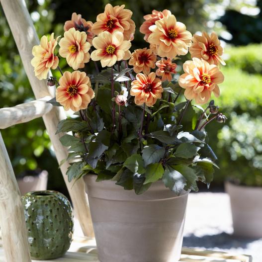 Les fleurs orangées et le feuillage pourpre font du Dahlia DREAMY® Eyes une variété originale qui saura attirer l'attention. Une plante compacte et de culture facile qui trouvera sa place autant en massif qu'en pot.