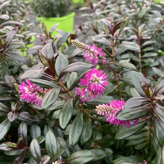 Joan Mac est une véronique au feuillage pourpre pratiquement toute l'année. Il n'y a que l'été que la plante présente un peu de rose. La floraison est violet foncé en fin de printemps et contraste bien avec le feuillage encore foncé. C'est une belle plante pour réaliser des potées.