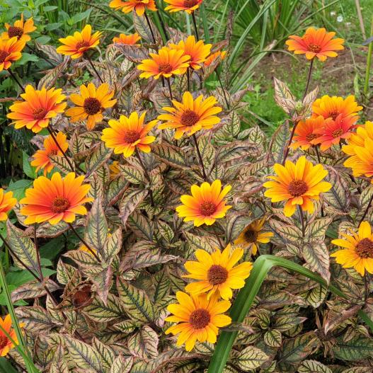 Avec son feuillage incroyablement marbré de blanc et de vert, rehaussé de nuances rosées en bordure, la fausse hélianthe Orange Marble est une œuvre d'art vivante. Ses fleurs orange vibrant s'ouvrent dans un éclat presque rouge pour évoluer vers une teinte jaune-orangé, créant un contraste saisissant avec son feuillage unique. Cette plante offre une combinaison parfaite de beauté artistique et de fleurs éclatantes, pour illuminer votre jardin tout au long de la saison.
