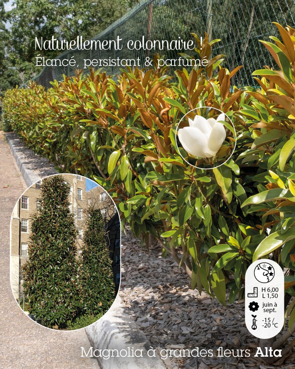 Un magnolia élégant, au port naturellement en colonne, idéal pour les jardins où chaque mètre carré compte. Ses grandes fleurs blanches parfumées illuminent l’été et contrastent avec son feuillage vert brillant. Rustique et persistant, il se prête aussi bien aux alignements qu’aux massifs et bacs. Une variété sophistiquée, facile à intégrer dans tous les projets.