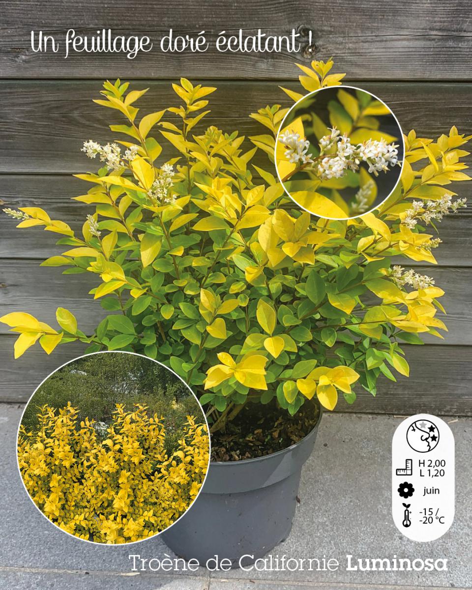 Avec son feuillage jaune d’or éclatant, Luminosa est l’arbuste idéal pour illuminer les zones plus ombragées du jardin. Persistant et rustique jusqu’à -20 °C, il garde tout son attrait au fil des saisons et s’adapte facilement à de nombreux sols. Son port compact et érigé en fait un excellent choix pour composer des haies denses, qu’elles soient libres ou taillées, mais aussi pour structurer des massifs ou égayer des compositions en bac. Au mois de juin, sa floraison blanche et légèrement parfumée vient compléter son charme.