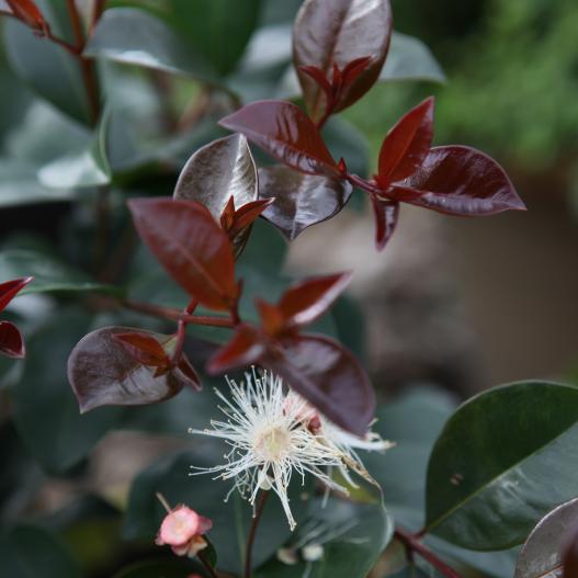 Les jeunes pousses toujours rouges donnent un aspect tonique à cette plante. Les feuilles sont brillantes et ne sont pas sensibles aux maladies. Les fleurs blanches viennent contraster avec le beau feuillage pour se mettre en valeur. La plante est facile à tailler pour maintenir une forme.