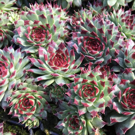 Le contraste entre les feuilles bleu-vert et les pointes pourpre font de cette joubarbe une variété originale. Une belle variété à associer aux autres joubarbes de la série CHICK CHARMS®.