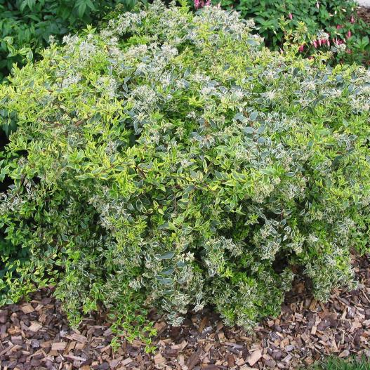Arbuste bien dense au feuillage persistant lumineux. Les jeunes pousses "jaune d'or" précèdent une abondante floraison rosée qui laisse apparaître un panachage bleu et vert. D'autres jeunes feuilles jaunes ornent ce subtil panachage.
