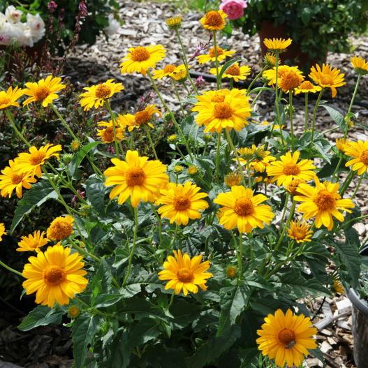 Tuscan Sun est une plante vivace qui présente une touffe compacte en fleur de juin aux gelées. Jamais vous ne voyez la défloraison car il y a toujours des fleurs nouvelles pour la recouvrir. C'est une plante qui couvre le sol et empêche la levée des mauvaises herbes.