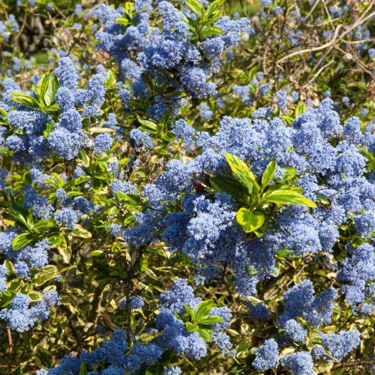 Son feuillage persistant subtilement panaché de jaune met en valeur ses fleurs printanières d'un bleu intense. Une floraison automnale est possible avec une taille après la première floraison de printemps.