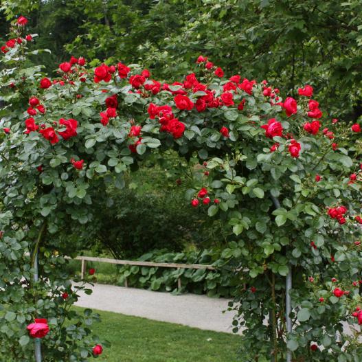 Une nouvelle génération de rosiers grimpants rouges est née avec cette variété qui possède beaucoup de qualités telles que la vigueur, la remontée de fleurs et surtout la résistance naturelle aux maladies. La fleur d'un rouge baiser est turbinée et possède de nombreux pétales. Elle a une bonne tenue en vase.