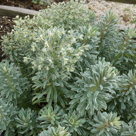 Glacier Blue est une euphorbe qui ne se ressème pas et qui n'est pas envahissante. Elle est unique par son feuillage panaché de bleu, vert et blanc. Elle est persistante et résiste bien au froid et au chaud. Sa floraison est panachée comme son feuillage. C'est une plante facile au jardin comme en bac ou en pot.