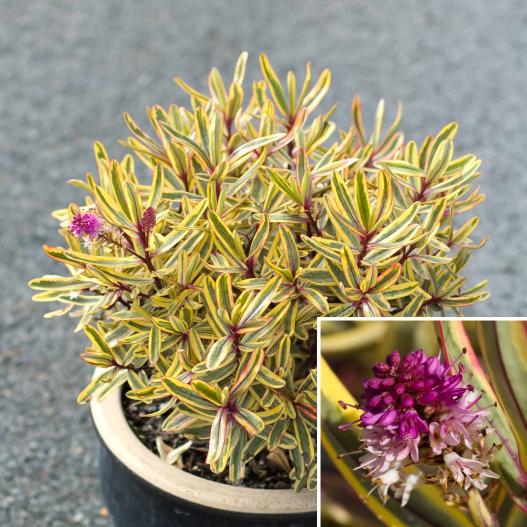 Variété originale aux feuilles longues panachées de jaune et de vert en été, qui changent de couleur en hiver pour présenter des nuances de rose et d'ocre. La floraison estivale est rose. La plante se plaît en pot comme en massif.