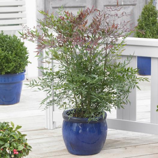 Ce bambou sacré se caractérise par son feuillage finement découpé et ses jeunes pousses pourpres. La floraison de fin d'été et la fructification rouge prolongent l'effet décoratif de cette belle plante persistante.