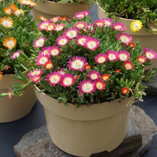 Vous marchez dans le désert, vous avez soif. Vous continuez, et ce que vous voyez ? Un paradis de couleurs... un rêve de fraîcheur ! Ces nouveaux Delosperma (fleurs de glace) sont maintenant disponibles. Jouez avec les belles couleurs. Ils n'ont pratiquement pas besoin d’eau, ils aiment la sécheresse et le plein soleil. Ces nouveaux Delosperma fleurissent de mai au début de l'hiver tant que le soleil brille. Ils peuvent aussi tolérer un hiver froid. Ils ne sont pas pour rien appelés “fleurs de glace”.