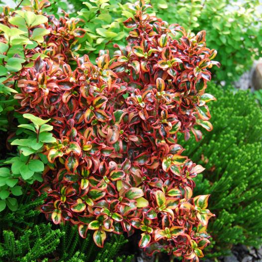 Inferno est un Coprosma qui rougit beaucoup avec les températures fraîches de l'automne et du printemps. Ses panachures crèmes et roses deviennent rouge et rose framboise en réaction aux températures basses. La plante est compacte et se comporte bien en pot comme en bac.