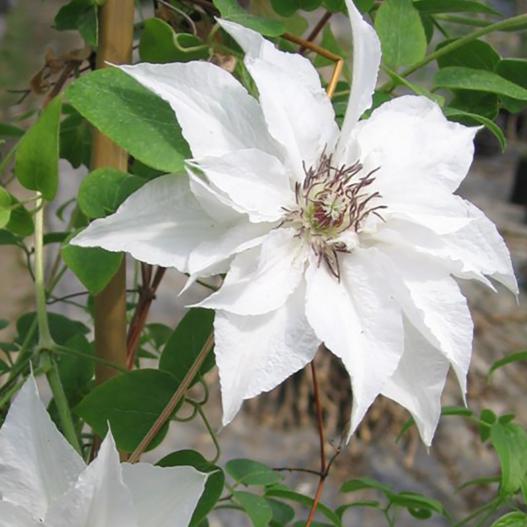 Très belle clématite aux nombreuses grandes fleurs fleurs blanches semi-doubles. Parfaite pour accompagner des arbutes sur un balcon ou une terrasse.
