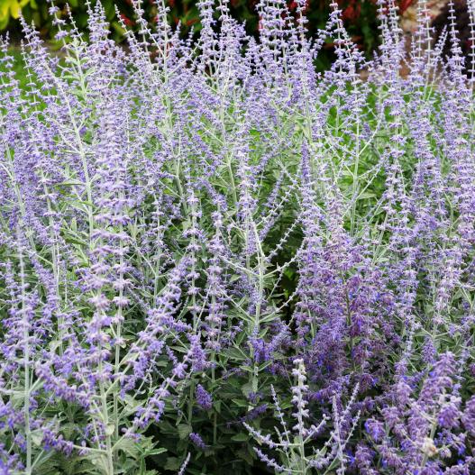 Avec son feuillage gris lumineux, ce perovskia se distingue de ses cousins. Il apporte un élément décoratif supplémentaire pour les périodes hors floraison. La floraison abondante bleue se marie bien avec le gris du feuillage et dure plus de 8 semaines. Il supporte les périodes sèches, les endroits réduits et toutes les conditions difficiles, mais toujours à la lumière.