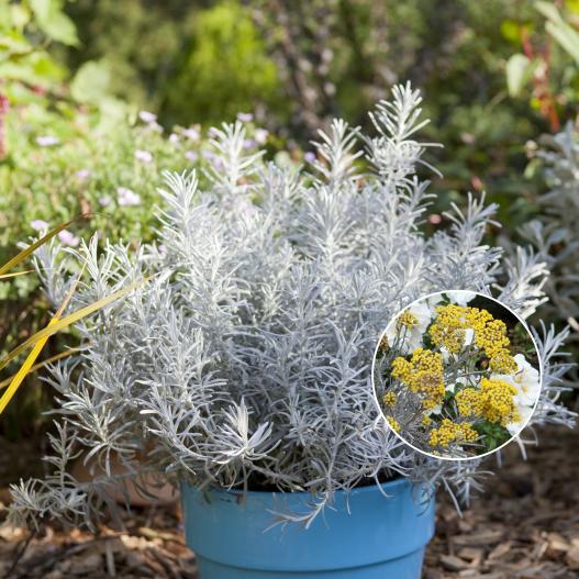 Ce spectaculaire buisson aux feuilles d'un rare gris argenté brillant est un merveilleux faire-valoir pour les fleurs qu'il accompagne. Il reste lumineux même mouillé. Très belle floraison jaune en été au parfum puissant de curry.