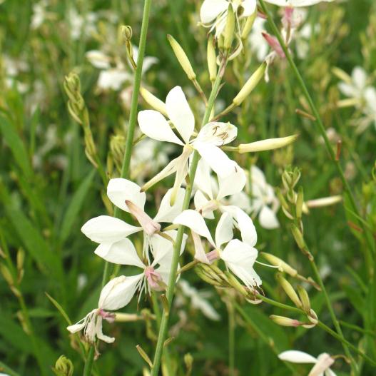 Les gauras vous séduisent par leur légèreté et par leur agilité dans le vent. Toutefois, lorsque la végétation est moins haute, ils ne se couchent pas et restent plus gracieux. Tels sont les gauras Walberton's sélectionnés pour leur port médiant et leurs grandes fleurs. Ces grandes fleurs se portent allègrement dans le vent et donnent au buisson une couleur blanche permanente du printemps aux gelées !