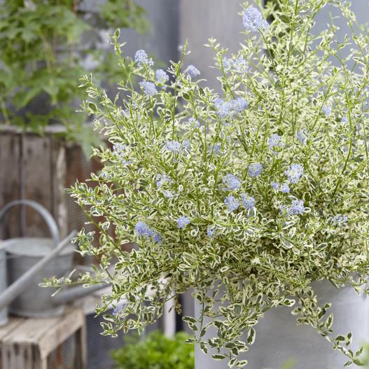 Cool Blue est un céanothe qui présente de petites feuilles délicatement panachées de blanc/crème et de vert. Ce feuillage persistant offre un bel écrin aux fleurs bleues qui surgissent au printemps et quelques fois un peu à l'automne. Ce céanothe aime se faire dorer au soleil et se plaît en bac ou en pot pour composer des associations élégantes.