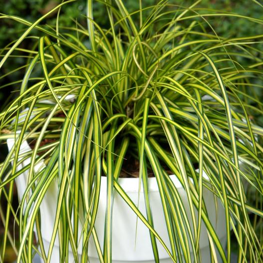 Son feuillage fin et persistant est étonnant, de couleur jaune marginé de vert. Plus la plante vieillit, plus ses feuilles s'allongent et deviennent gracieuses et retombantes lorsqu'on place la plante auprès d'un surplomb. En été, ses fleurs brunes et crème apparaissent pour laisser l'automne arriver. Eversheen peut être utilisé en couvre-sol mais également en rocaille ou en pot pour alléger des compositions trop lourdes.