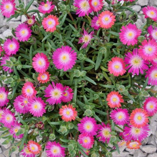 Vous marchez dans le désert, vous avez soif. Vous continuez, et ce que vous voyez ? Un paradis de couleurs... un rêve de fraîcheur ! Ces nouveaux Delosperma (fleurs de glace) sont maintenant disponibles. Jouez avec les belles couleurs. Ils n'ont pratiquement pas besoin d’eau, ils aiment la sécheresse et le plein soleil. Ces nouveaux Delosperma fleurissent de mai au début de l'hiver tant que le soleil brille. Ils peuvent aussi tolérer un hiver froid. Ils ne sont pas pour rien appelés “fleurs de glace”.