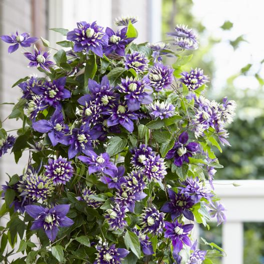 Taiga est une clématite aux fleurs doubles mauves aux pointes de pétales vert chartreuse. Les fleurs ressemblent aux fleurs de dahlia cactus. Elles s'épanouissent lentement depuis le gros bouton vert puis s'ouvrent en mauve et vert pour terminer blanc crème rosé. La floraison s'étale du printemps aux gelées sur une plante de moyenne dimension qui se plaît au jardin comme en pot. Les clématites peuvent se faufiler partout : dans vos arbustes, dans vos plantes grimpantes établies ou bien seules sur un support. Pas d'entretien particulier, juste une taille de nettoyage au printemps et ensuite, des fleurs à profusion.