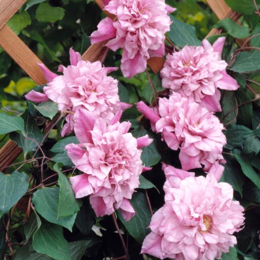 Superbe clématite aux grandes fleurs doubles. Convient pour les massifs, les haies, mais également en pots ou en bacs. À mélanger avec des arbustes ou autres grimpantes aux feuillages colorés. La seconde floraison est simple et elle intervient en septembre.
