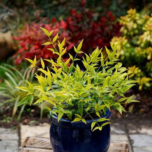 Le feuillage de ce bambou sacré est particulièrement lumineux. Les feuilles qui apparaissent au printemps ont une belle teinte vert citron. Avec son feuillage très découpé et son port dressé et buissonnant, cette arbuste ressemble à un petit palmier. En association avec des feuillages plus foncés ou arborant des teintes rouges, le résultat sera particulièrement graphique.