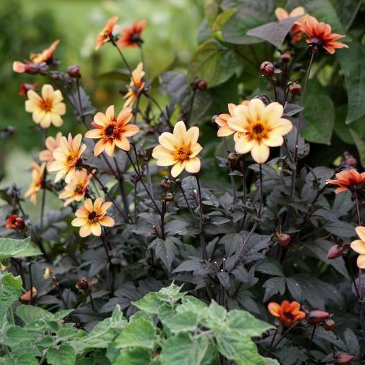 Nouveau dahlia avec feuilles pourpre foncé. Le contraste est parfait avec les fleurs de couleur pêche avc des mèches rouge et un cœur noir. La plante est généreuse et produit des fleurs jusqu'aux gelées. Les fleurs fanées ne se voient pas, ce qui offre toujours un bel effet décoratif et ne procure pas de travail au jardinier ! Un peu d'eau régulièrement tout l'été, c'est tout ce que réclame comme entretien cette belle plante qui se complaît au soleil et s'accomode de la mi-ombre. Les tubercules peuvent se conserver l'hiver au sec et se replanter tous les ans.