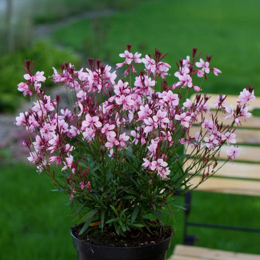 C'est un petit Gaura qui présente à la fois la légèreté des fleurs qui volent au vent mais qui reste court pour ne pas s'écrouler sous la pluie et le vent. Il se faufile partout et permet des réalisations légères.