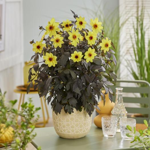 La mise en valeur des fleurs jaunes au cœur noir sur le feuillage pourpre est réussie. La plante est généreuse et produit des fleurs jusqu'aux gelées. Les fleurs fanées ne se voient pas, ce qui offre toujours un bel effet décoratif et ne procure pas de travail au jardinier ! Un peu d'eau régulièrement tout l'été, c'est tout ce que réclame comme entretien cette belle plante qui se complait au soleil et s'accomode de la mi-ombre. Les tubercules peuvent se conserver l'hiver au sec et se replanter tous les ans.