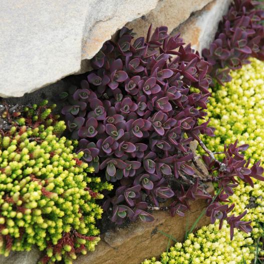 Le feuillage de Firecracker est d'un beau rouge bordeaux contrastant avec les jeunes pousses de couleur verte. La plante possède un port rampant, dense et compact ne se dégarnissant pas au cœur. Sa floraison rose est spectaculaire et intense.