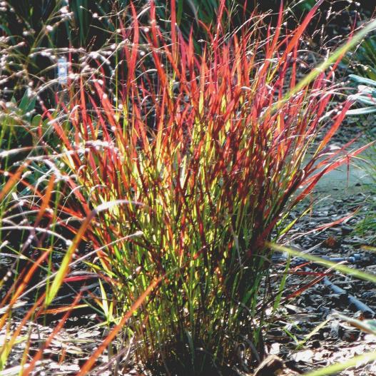 Ce panicum est étonnant pour les couleurs de son feuillage : d'un vert très vif à la base, les feuilles se finissent par un rouge foncé. De même couleur que l'Imperata 'Red Baron', il est plus facile à cultiver et garde ses couleurs toute la saison.