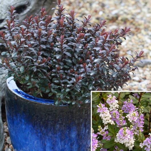 Avec son feuillage bronze toute l'année, cette véronique est unique. La floraison bleue qui complète la panoplie du décor rend cette plante indispensable pour votre jardin ou votre terrasse.