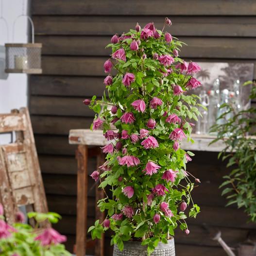 Clématites Collection® "Généreuses et faciles" : Une sélection de Clématites qui peuvent se faufiler partout : dans vos arbustes, dans vos plantes grimpantes établies ou bien seules sur un support. Pas d'entretien particulier, juste une taille de nettoyage au printemps et ensuite, des fleurs à profusion.