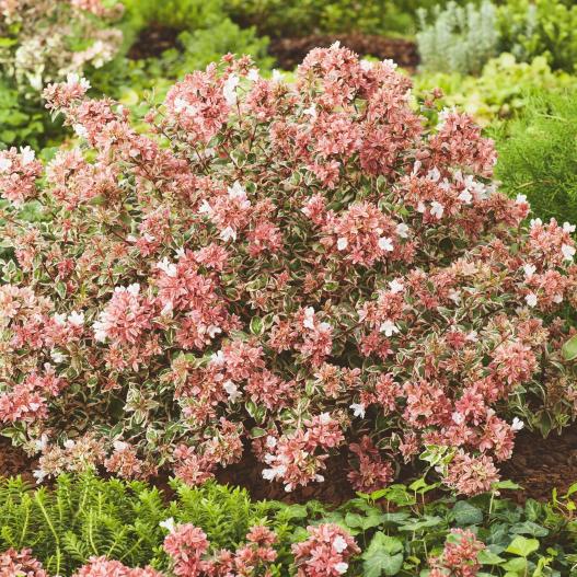 Arbuste compact naturellement en forme de boule. Il restera décoratif même en hiver avec ses feuilles panachées vertes bordées de crème et irrégulièrement de rose. Jolie floraison blanche en été prolongée par les sépales roses qui persistent longtemps après la chute des fleurs.