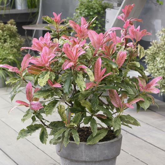 Pink crispy est issu d'une sélection rigoureuse entamée il y a 15 ans. Il est unique par son feuillage crispé, brillant, persistant, panaché de crème et de rose. Mais surtout, il est illuminé par ses jeunes pousses roses 3 à 4 mois par an ! Il n'est pas exigeant et s'accommode de tous les terrains. Il est un élément de décoration indispensable au jardin mais également en pot et sur les terrasses et balcons.