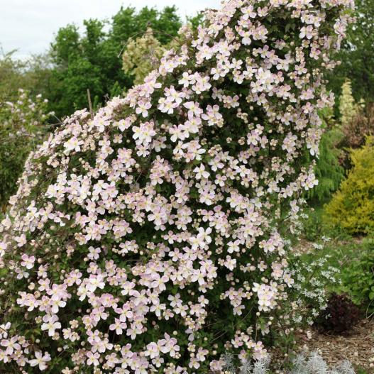Cette clématite montana s'épanouit avec des fleurs roses de grande taille (> 10 cm). Elles sont nombreuses sur une plante généreuse qui se plaît au soleil comme à la mi-ombre. Son feuillage est plus foncé, dans les teintes pourpres, quand il est au soleil.