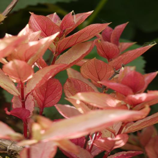 Ce chèvrefeuille est intéressant pour ses jeunes pousses rose-crème presque transparentes. Elles laissent place à un feuillage vert au courant de l'été. Des fleurs rose sur l'extérieur et crème à l'intérieur apparaissent au milieu des jeunes pousses printanières, ce qui leur donne un effet d'écrin pour les mettre en valeur.