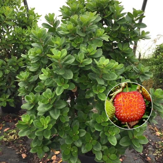 Cette sélection présente des feuilles orbiculaires ce qui n'est pas courant chez les Arbutus. Les entre-nœuds sont courts et serrés, ce qui densifie naturellement la plante. La plante est beaucoup plus dense que la variété type et elle devient interessante pour les petits jardins. La floraison est blanche à l'automne et les fruits apparaisent à l'automne suivant en forme de fraise.