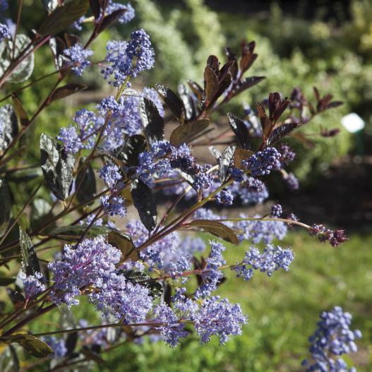 Ce céanothe érigé présente une superbe robe noire toute l'année. Des fleurs bleu ciel viennent illuminer cette plante en juin-juillet. Sa forte végétation lui permet de trouver sa place dans les haies mixtes ou en arrière-plan de massif.
