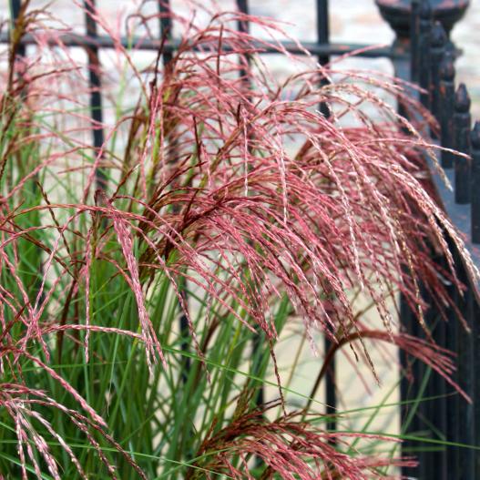 Avec son mètre de haut maxi, ce miscanthus aux grands épis rouges agrémente les massifs et les bacs en fin d'été. C'est une plante facile qui ne demande pas d'entretien particulier.