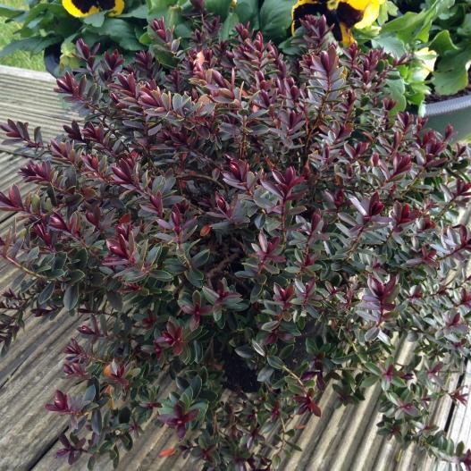 Matty Brown est une variété très compacte qui forme un coussin de 40 cm de côté environ et qui présente un feuillage évolutif de la fin de l'été au printemps en passant du vert au rouge puis au pourpre. Les fleurs violettes apparaissent en juin-juillet. Excellente plante pour les pots et bacs.