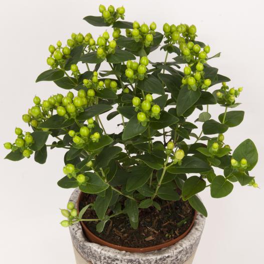 Le millepertuis MIRACLE® Pistache porte après sa floraison jaune d'inombrables petites boules vertes évoquant des pistaches, donnant à l'arbuste un aspect très décoratif même après la floraison. Tailler à 10 cm en mars pour obtenir de gros fruits.