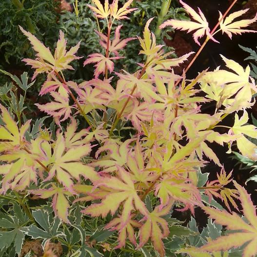 Son feuillage est vert-jaune pâle au débourrement, puis les panachures blanches des feuilles apparaisssent à la fin du printemps. Les jeunes pousses sont jaune et rose. Magnifique à l'automne où il prend une belle coloration qui varie du rouge orange au rouge violet. À protéger des courants d'air froid.