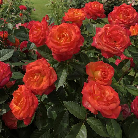 Feurio est un rosier buissonnant arbustif aux nombreuses fleurs hybride de thé, très doubles et souvent disposées en ombelles. Les couleurs de la fleur passent du rose au saumon puis à l'orange ce qui donne cet effet vibrant.