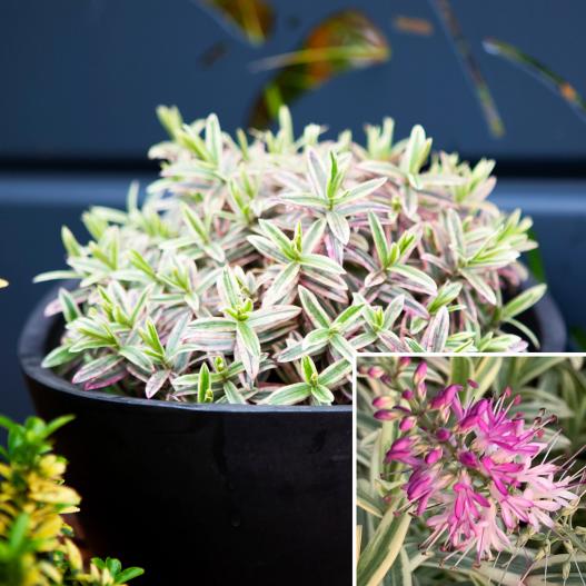 Son feuillage vert et crème persistant ne change presque pas contrairement aux autres Hebe. L'hiver, il est toujours de la même couleur, de même que les jeunes pousses. Il peut se placer au jardin en premier plan, mais également en pot ou en bac.