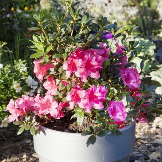 Avec deux floraisons par an, au printemps et à l'automne, cette azalée prolonge l'éphémère des variétés classiques en arborant des fleurs d'un rose vif.